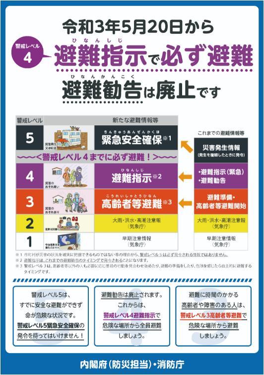 令和3(2021)年5月20日から、避難勧告と避難指示が「避難指示」に一本化されました。