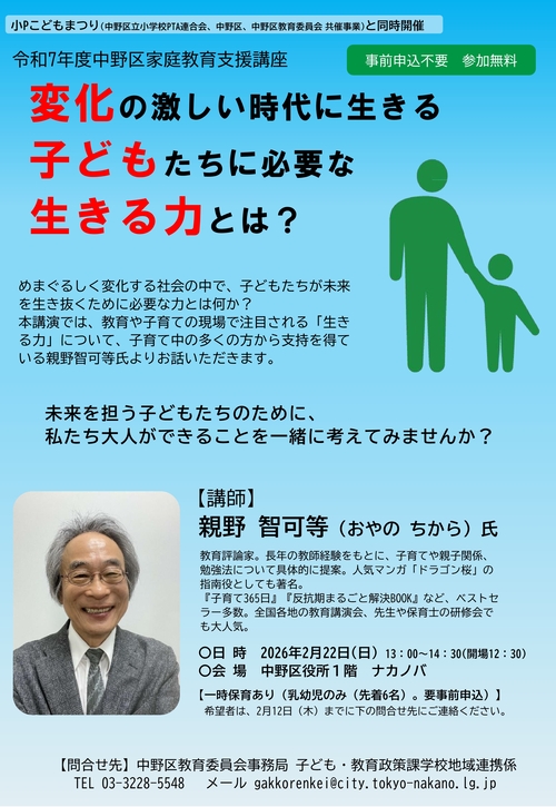 親野智可等(おやのちから)氏講演『変化の激しい時代に生きる子どもたちに必要な生きる力とは?』(中野区家庭教育支援講座)