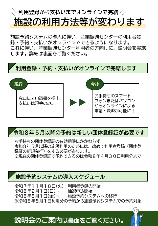 (こちらの説明会は、産業振興センター利用者を対象としています。その他の施設をご利用の方は、各施設の説明会情報等をご確認ください。)
