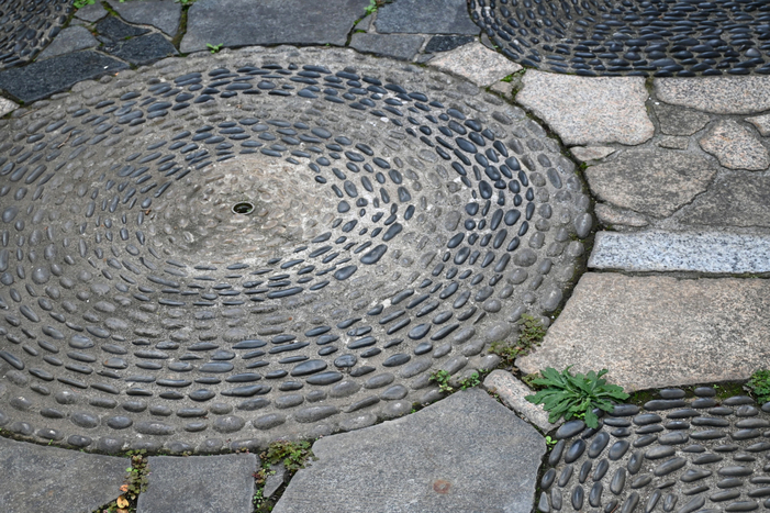 中庭には別宅のあった大磯の海岸から節子が持ち帰った石が埋め込まれている 撮影者:Kana Naka