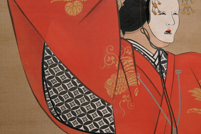臨場感のある構図の中、人物の表情や衣装の文様までもが緻密に描き出されています。