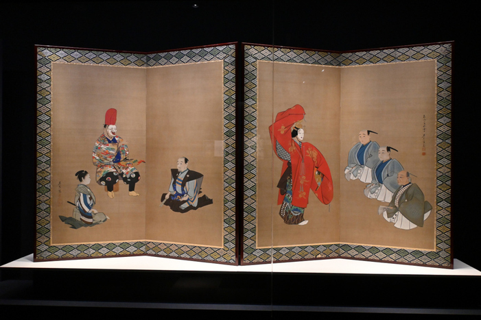 右隻に能〈羽衣〉を、左隻に狂言〈福の神〉を描いた能絵の屏風。
