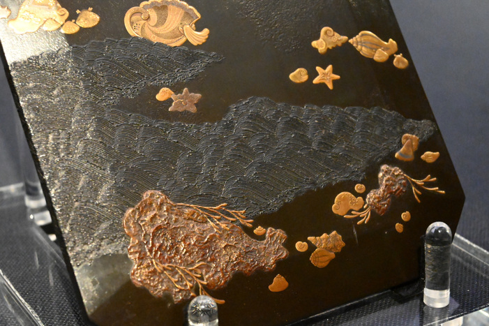是真が生み出した変わり塗の代表とも言える青銅塗の地に、青海波塗で見事な波が表された硯箱。青銅塗は漆で青銅のような重厚な質感を出す技法。よく見ると、金粉を使用した貝のモチーフの中には吉祥文が散りばめられています。是真の超絶技巧(蒔絵技術)を随所に堪能できる傑作です。