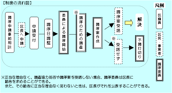 区長への調停の申請に基づき、弁護士や福祉の専門家などの紛争調停委員が、公平な第三者の立場から調査し、調停案を提示するなどして紛争の解決を図ります。