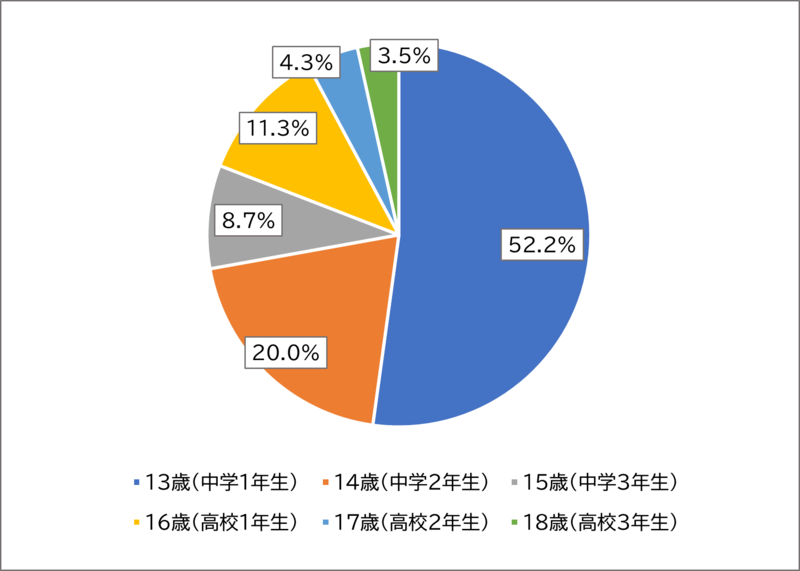 最も多く回答されたのが13歳(中学1年生)の52.2%であり、次に多いのが14歳(中学2年生)の20.0%でした。