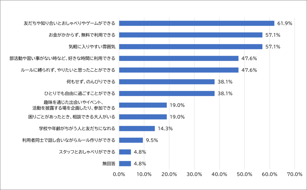 最も多く回答されたのが「友だちや知り合いとおしゃべりやゲームができる」の61.9%で、次に多かったのが「お金がかからず、無料で利用できる」と「気軽に入りやすい雰囲気」の2つであり、同数の57.1%でした。
