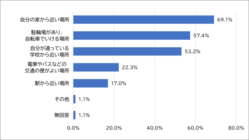 最も多く回答されたのは「自分の家から近い場所」の69.1%であり、次に多く回答されたのは「駐輪場があり、自転車でいける場所」の57.4%でした。