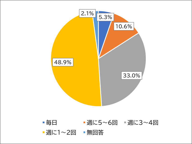 最も多く回答されたのが「週に1~2回」の48.9%であり、次に多く回答されたのは「週3~4回」の33.0%でした。