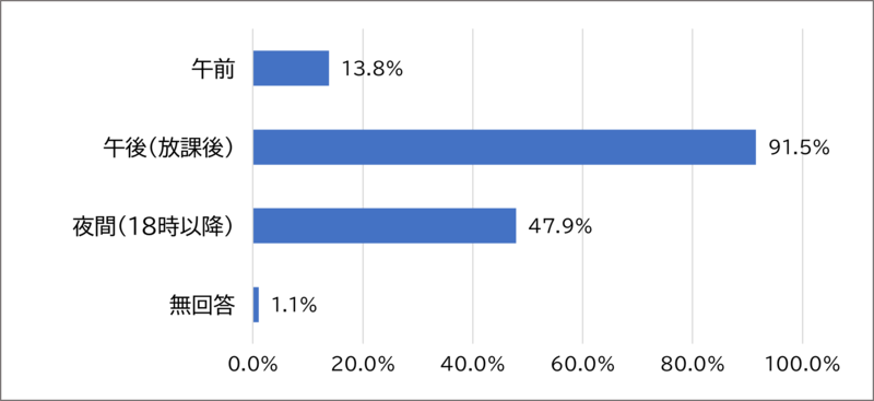 最も多く回答されたのが「午後(放課後)」の91.5%であり、高い割合を占めていました。