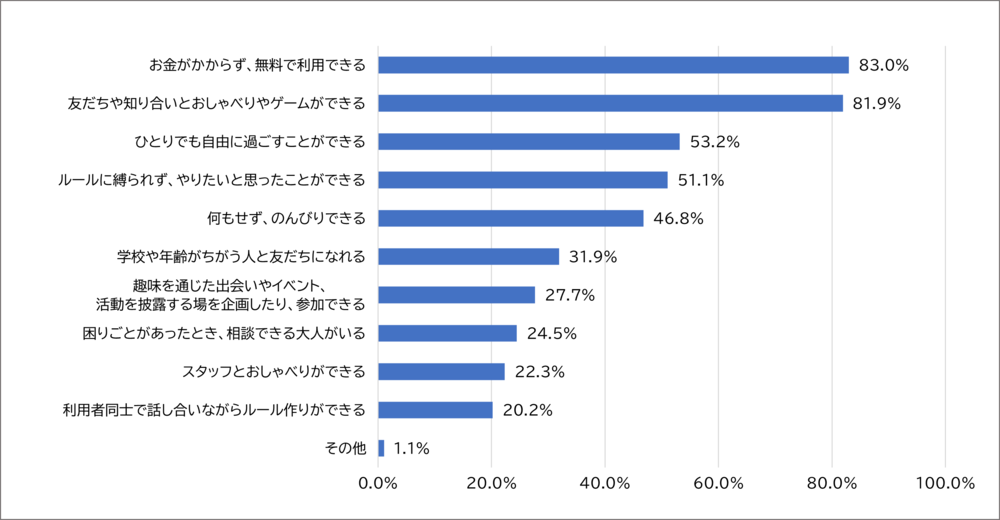 「お金がかからず、無料で利用できる」が83.0%と「友だちや知り合いとおしゃべりやゲームができる」が81.9%と高い割合を占めました。次に高い回答率であったのは「ひとりでも自由に過ごすことができる」の53.1%でした。