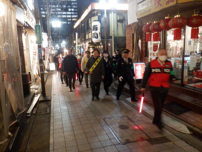 令和7年12月18日(木曜日)、年末で賑わう中野駅北口の繁華街で夜間合同パトロールを行いました。