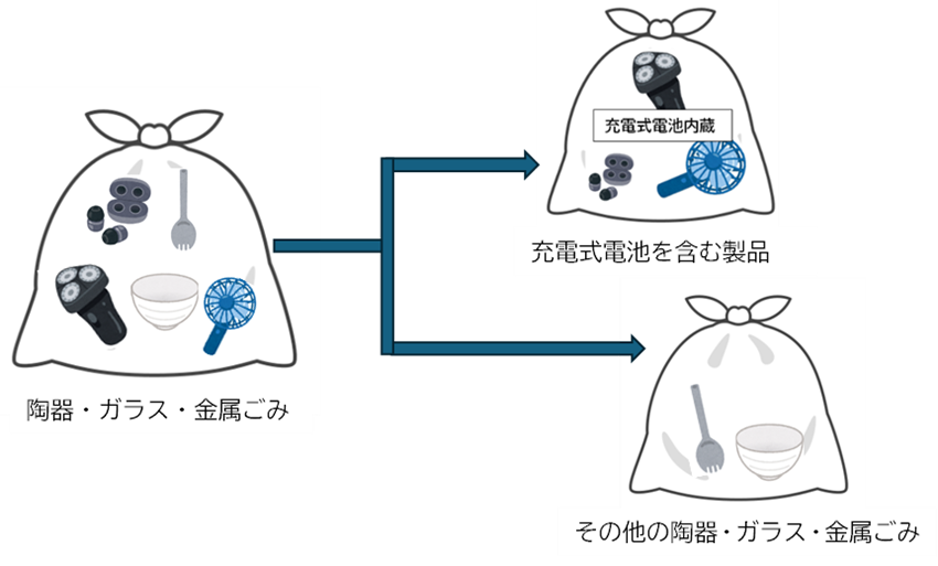 「陶器・ガラス・金属ごみ」の収集日に、他のごみとは別の袋に入れ、中身が何か分かるよう袋に「充電式電池内蔵」と記載して出してください。