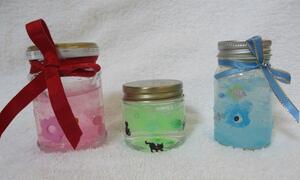 保冷剤に好きな色や香りをつけたあと、空きびんをシールやリボンで飾ります。