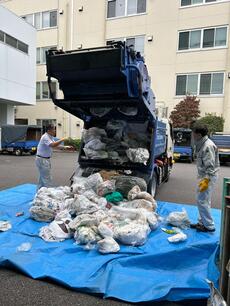 ごみのんカーの積込実演、リチウムイオン電池の回収を行います。