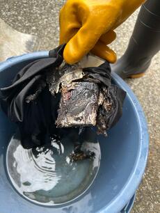 (写真は左から、火元確認のためごみ収集車からごみを開けている様子、発見時のモバイルバッテリー、水につけ鎮火したモバイルバッテリー)