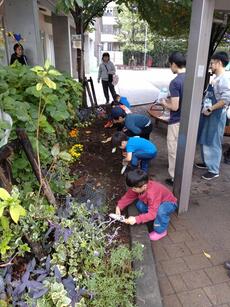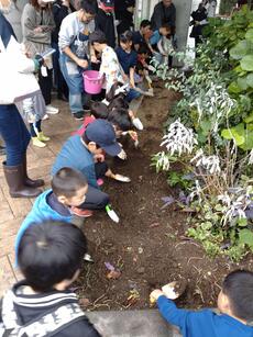 10月26日、コンポスターで作ったたい肥を使って、おかのうえ公園の花壇にチューリップとヒヤシンスの球根を植えました。生ごみがたい肥になる仕組みや球根の植え方の説明を聞いてから、子どもたちがスコップを手に一生懸命、丁寧に球根を植えていました。家庭から出た生ごみがたい肥となって土に返って花を咲かせるという循環を感じられるのもこの活動の魅力です。