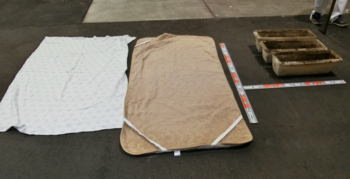 (写真は左から、搬入物検査の様子、粗大ごみとなる敷マットと大きいプランター)