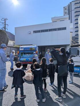 お礼に、スケルトン清掃車「ごみのんカー」の実演を披露し、ごみを積み込む様子などを楽しんでもらいました。