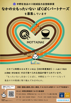 中野区では、食品ロス削減に積極的に取り組むお店を協力店(ぱくぱくパートナーズ)として登録し、食べ残し等で発生する「もったいない」をなくすことを目指しています。また、全国おいしい食べきり運動ネットワーク協議会では、12月~1月の年末年始の外食時での食べきりを呼びかける共同キャンペーンを実施しており、中野区もぱくぱくパートナーズのお店と協力して、お客さまへ「食べきり」のご協力を呼びかけています。