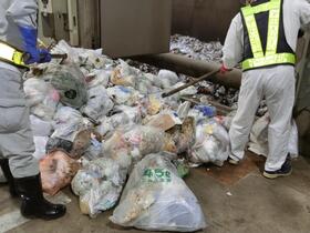 清掃工場では、家庭から出された燃やすごみを安全に焼却処理するため、不燃ごみや粗大ごみ、危険物などが混ざっていないか、搬入物の検査を行っています。