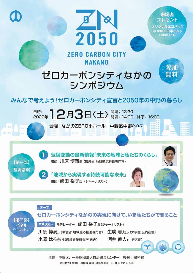 ゼロカーボンシティなかのシンポジウムでは、「みんなで考えよう!ゼロカーボンシティ宣言と2050年の中野の暮らし」をメインテーマに、地球温暖化や気候変動の現状や課題・取組などについて、多様な登壇者をお招きしわかりやすくお話いただきました。