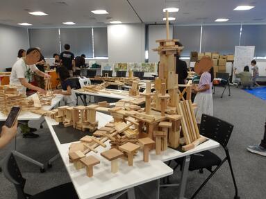 ブルーシートに沢山の木材(端材)を広げ、お子様と保護者の皆様に触れていただきました。端材を積んでタワーをつくったり、並べて顔をつくったりと”造形あそび”を行いました。最後は用意した端材全てを自由に使ってもらい、様々な個性的な作品ができあがりました。