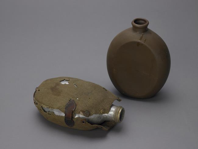 (画像:15KB) | アルミ製(左)と陶製(右)の水筒 鉄や銅などの金属製の家庭用品は兵器の生産に使われるために国にさしだされ、陶製やアルミ製のものが作られた。 |