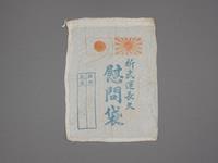| 慰問袋 戦地で苦労している兵士をなぐさめるため慰問袋を作った。中身は靴下・チリ紙・手紙などであった。無事を祈って「千人針」を縫って入れたりもした。 新井 安江紀子氏より寄贈 |