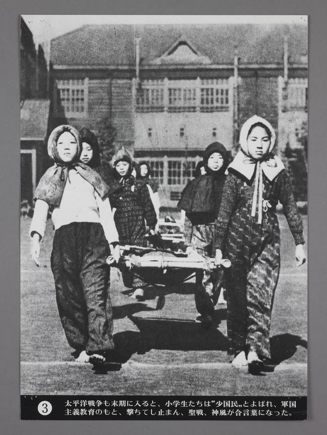 (画像:97KB) | 太平洋戦争も末期に入ると、小学生たちは「小国民」と呼ばれ、軍国主義教育のもと、撃ちてし止まん、聖戦、神風が合言葉になった。 |