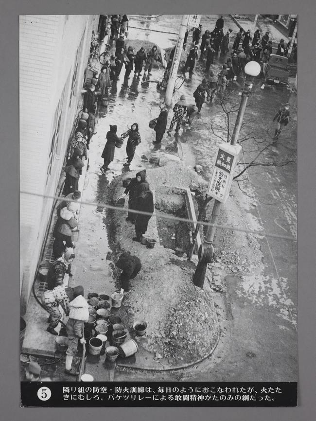 隣り組の防空・防火訓練は、毎日のようにおこなわれたが、火たたきにむしろ、バケツリレーによる敢闘精神がたのみの綱だった。 | |