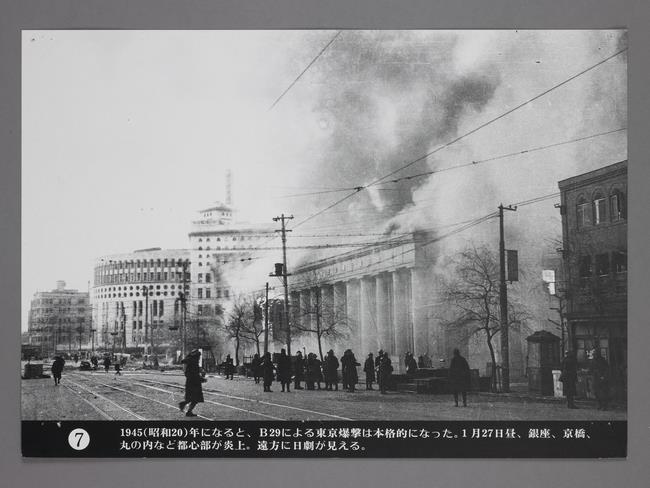 (画像:44KB) | 1945(昭和20)年になると、B29による東京爆撃は本格的になった。 1月27日昼、銀座、京橋、丸の内など都市部が炎上。遠方に日劇が見える。 |