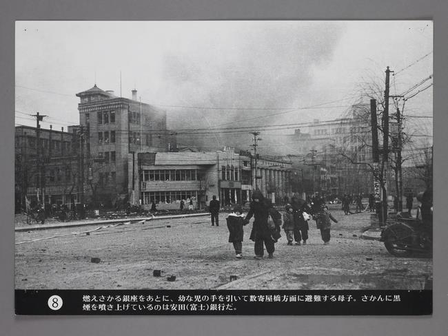 (画像:49KB) | 燃えさかる銀座をあとに、幼な児の手を引いて数寄屋橋方面に避難する母子。さかんに黒煙を噴き上げているのは安田(富士)銀行だ。 |