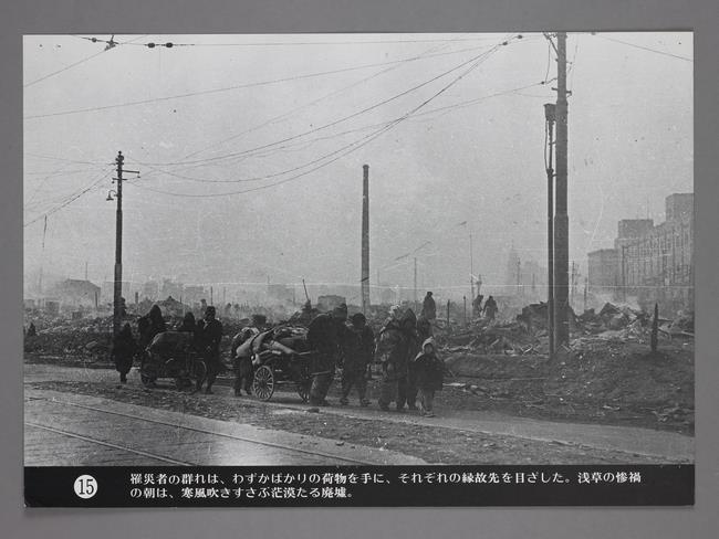 (画像:43KB) | 罹災者の群れは、わずかばかりの荷物を手に、それぞれの縁故先をめざした。浅草の惨禍の朝は、寒風吹きすさぶ茫漠たる廃墟。 |