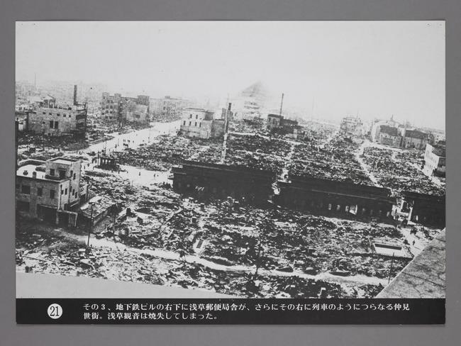 (画像:60KB) | その3、地下鉄ビルの右下に浅草郵便局舎が、さらにその右に列車のようにつらなる仲見世街。浅草観音は焼失してしまった。 |