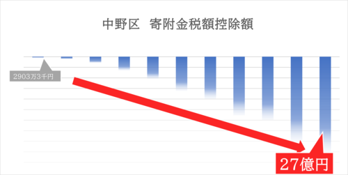 しかし、自治体から贈られる返礼品を目的とした寄附が増加したことから、本来中野区に納められるはずだった住民税の流出は年々増え、令和6年度においては約27億円と、巨大な額になっています。