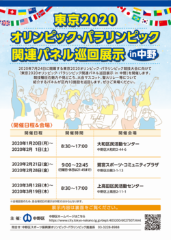 2020年7月24日から開催される東京2020オリンピック・パラリンピック競技大会。大会開催の気運をさらに盛り上げるため、「東京2020オリンピック・パラリンピック関連パネル巡回展示 in 中野」を開催します。競技種目の魅力や見どころ、大会マスコット、聖火リレー等について紹介するパネルが区内の施設を巡回します。 皆様、お誘いあわせのうえご来場ください。