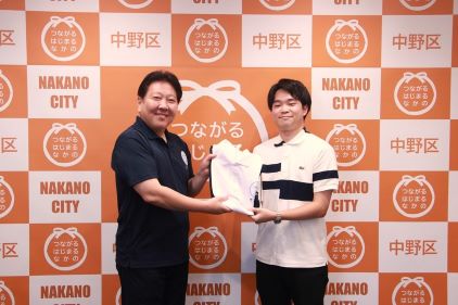 11月の中野区独自のデジタル地域通貨事業の開始に併せて、愛称とロゴマークを公募しました。90点の応募があった中から、愛称は「ナカペイ」に決定し、提案者の中野裕貴さんに副賞の贈呈式を行いました。