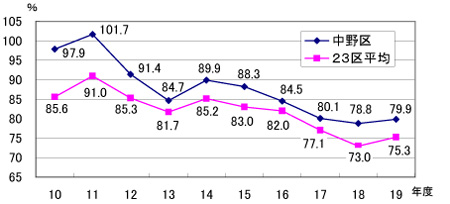 | 中野区 | 97.9 | 101.7 | 91.4 | 84.7 | 89.9 | 88.3 | 84.5 | 80.1 | 78.8 | 79.9 |